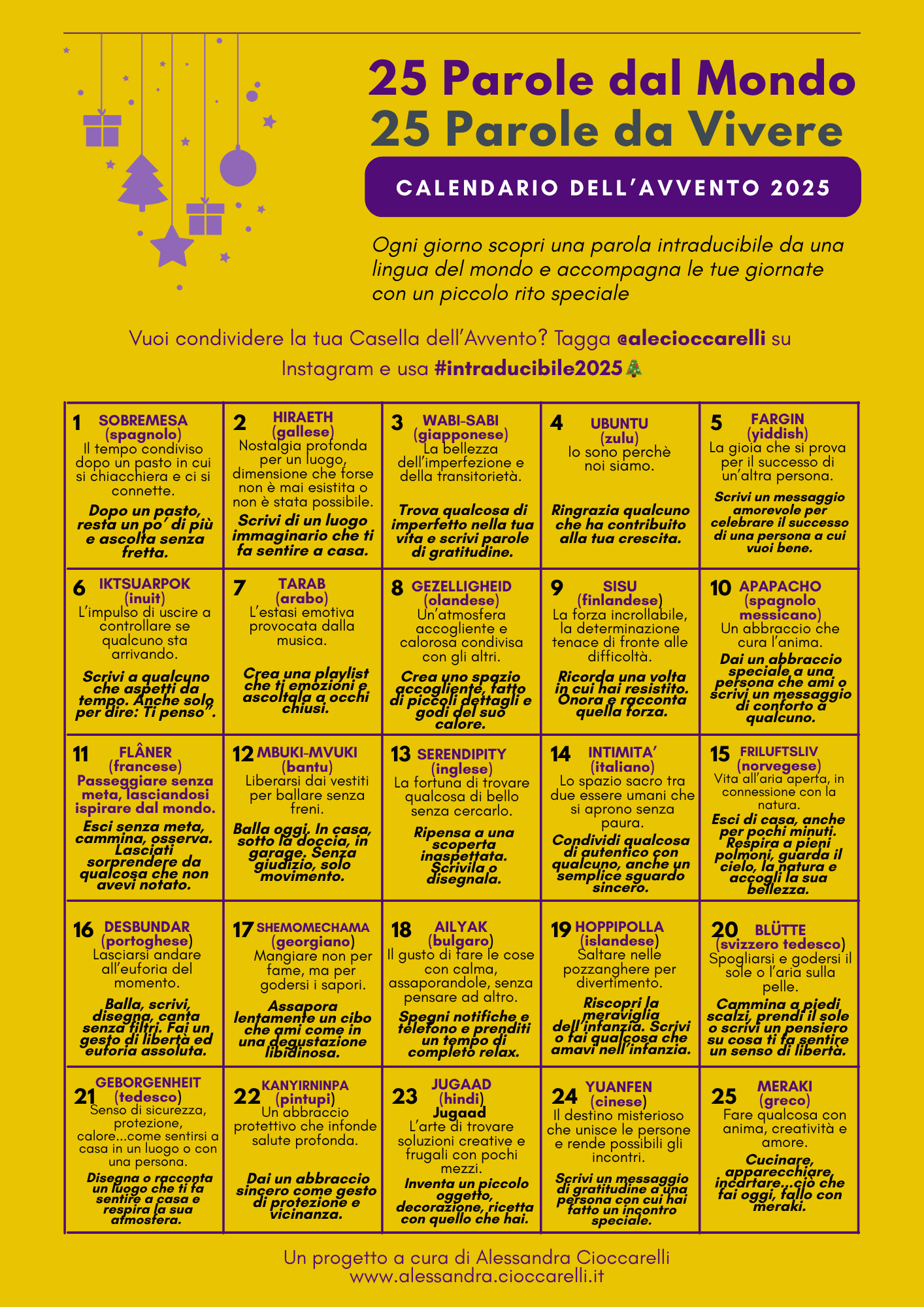 Scarica gratuitamente il Calendario dell'Avvento...intraducibile! Ogni giorno scopri una parola intraducibile da una lingua del mondo e accompagna le tue giornate con un piccolo rito speciale di scrittura, creatività, amicizia...e molto altro.